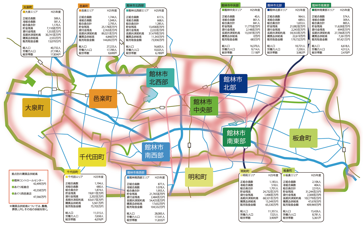 - 新店舗の建設において、組合員数・貯金や貸出金残高・長期共済保有高・購買品供給高などや人流・車流などの生活行動範囲から、一定のエリアを区分し推定すること。